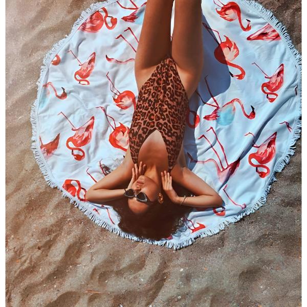 A kör alakú törölközőt a strandon vagy a medence mellett való pihenésre szánjuk, ugyanakkor a test köré kötve ruhadarabként is viselhető.