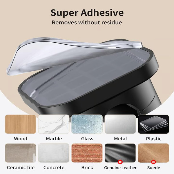 Szilárdan rögzül sík felületeken, például fán, csempén, fémen és sima falakon.
