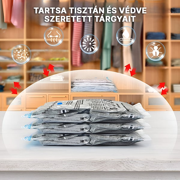 Fogy a hely a szekrényben? Küzd, hogy minden beleférjen a bőröndbe? A VACKBAGS vákuumos tárolózsákok akár 80%-kal tömörítik a terjedelmes tárgyakat, azonnal helyet teremtve a fontos dolgoknak. Egyszerűen pakolja be a ruhákat vagy ágyneműt, zárja le a zsákot, és használjon bármilyen háztartási porszívót a levegő kiszívásához – kevesebb mint 60 másodpercet vesz igénybe. Több hely, kevesebb rendetlenség, nulla macera.