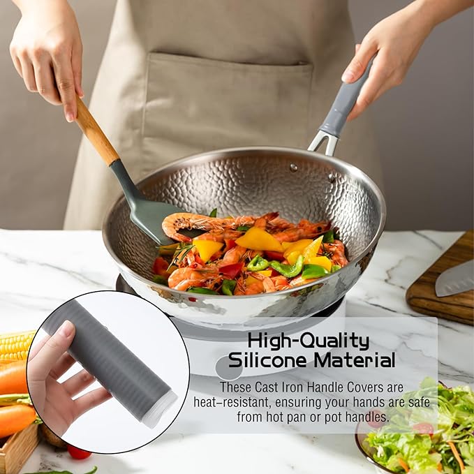 Szilikonborítóinkat úgy terveztük, hogy a fazék- és serpenyőfogantyúk széles skálájával kompatibilisek legyenek, így sokoldalú és adaptálható konyhai kiegészítőkké válnak, tökéletesek öntöttvas serpenyőkhöz és lapos aljú serpenyőkhöz.